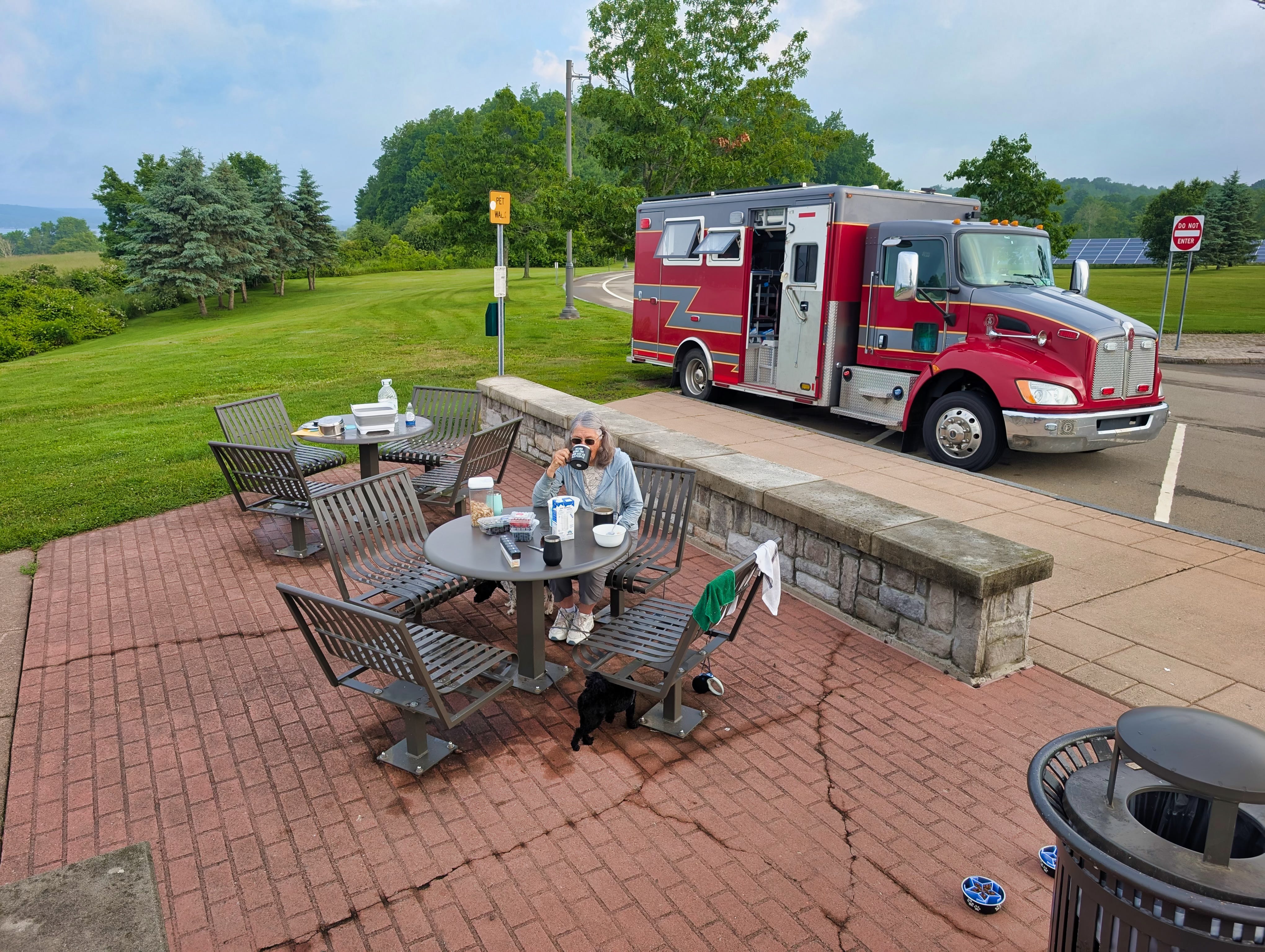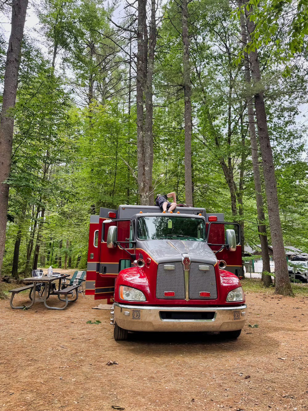 When we left on our cross-country trip, we didn’t have 110V electricity, running water or a table to eat on, and rest stops were our go to campsites. But as we traveled across the country, Wayne continued to get projects done. We got 110V power in some state in the northeast, running water in the sink in Ontario, and later on, we got a plywood table inside truck.